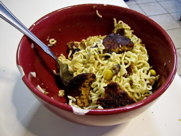 After my run today I decided to whip up a quick, vegan, protein-filled lunch. I used a recipe found in PETA’s Vegan College Cookbook called “Dorm-room Ramen Delight.” True, I don’t live in a dorm room, but I’m still a poor college student and still love Ramen noodles. I added a cut-up Morningstar Farms spicy black bean burger to this pasta dish for a richer taste and protein, and it turned out delicious. Recipe is as follows:
