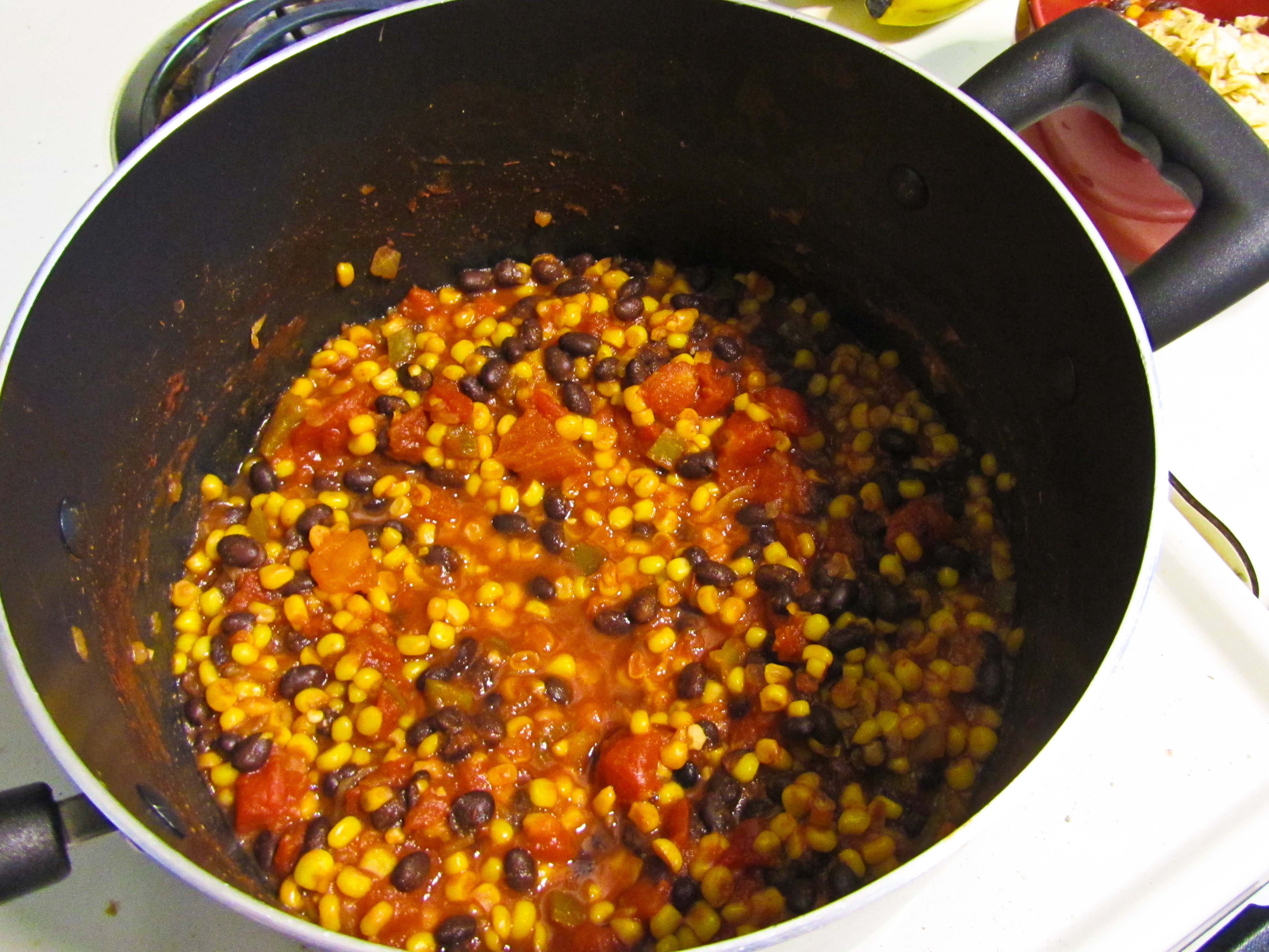 Cooking this dish is absurdly simple. Put everything in a large pot and cook uncovered on medium heat until the corn and beans are tender and everything is hot. Add cumin and chili powder to taste as you cook. This last time I made the chili, I added a dash of ground cinnamon on a whim, and it turned out very well; it gave the spicy dish a bit of sweetness and a very interesting combination of tastes.