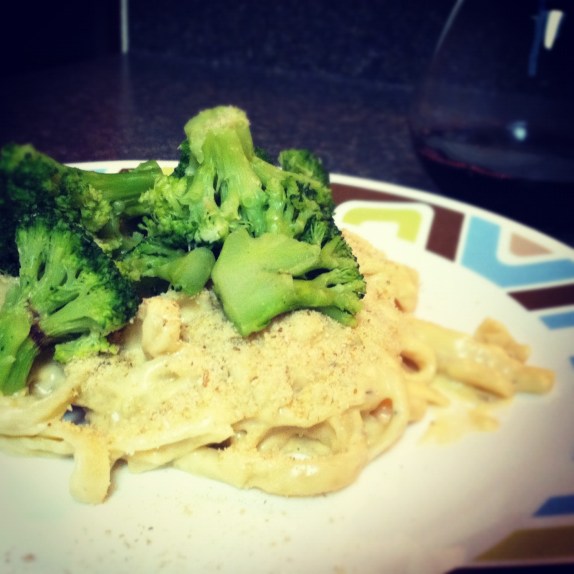You’re done! I topped mine with breadcrumbs, for a bit of extra texture, and broccoli, because it’s the best vegetable. I also paired it with a Cabernet Sauvignon. This bold red is a great match for a rich, creamy dish, not to mention it’s delicious and goes wonderfully with anything cheesy!