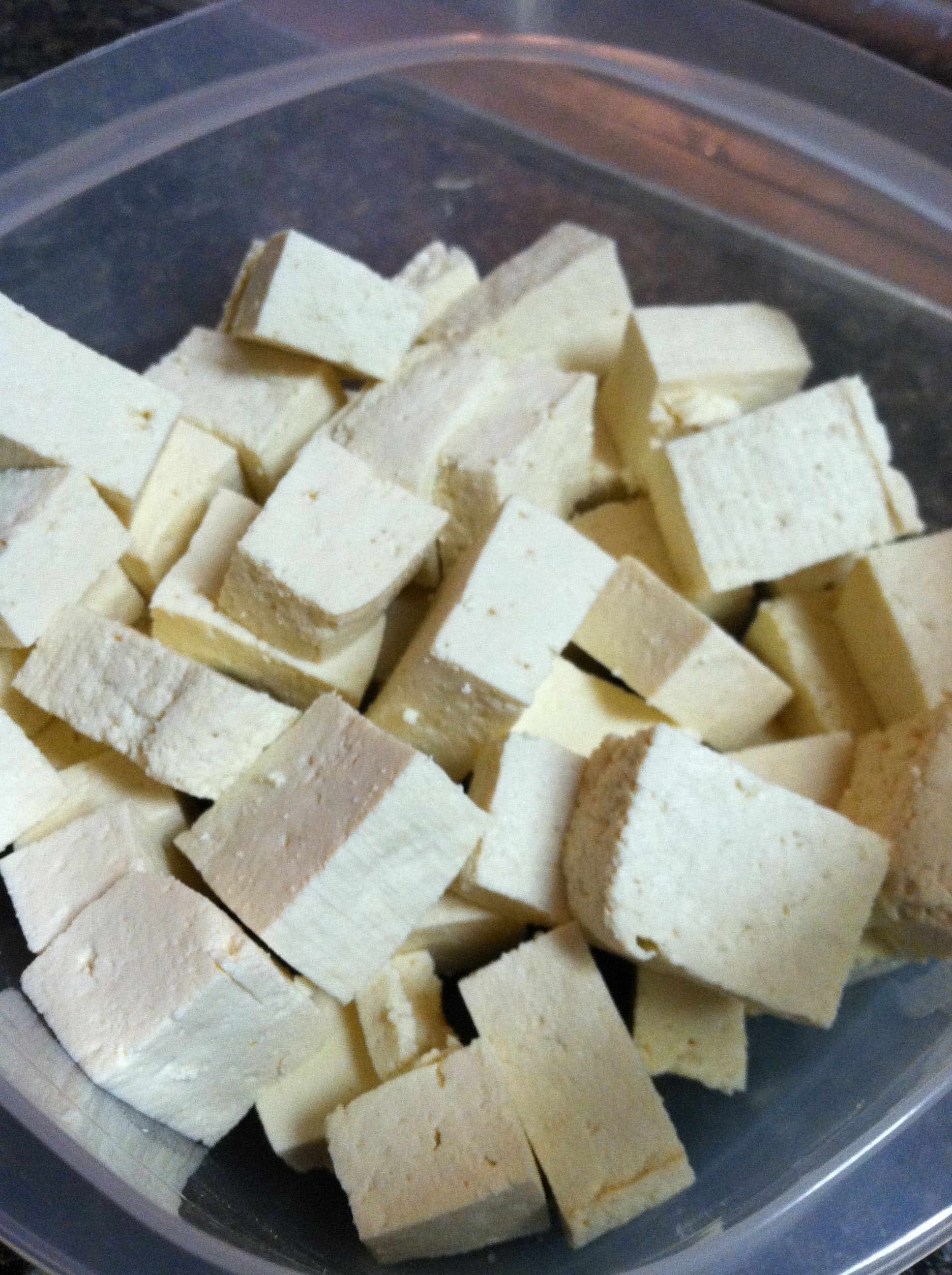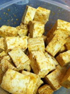 Drain tofu either in a tofu press, or by placing it between towels with something heavy on top. Chop tofu into small pieces and place in tupperware container with lid. Sprinkle garlic powder (about a teaspoon, but more if you’re a garlic fanatic like me and vice versa) over the chopped tofu. Pour soy sauce and teryaki sauce over the tofu (about a 1:2 ratio of soy to teryaki sauce), until tofu is coated, and only a little bit of sauce is pooling at the bottom of the container. Let sit for 30 minutes, shaking up the container every 5 minutes.