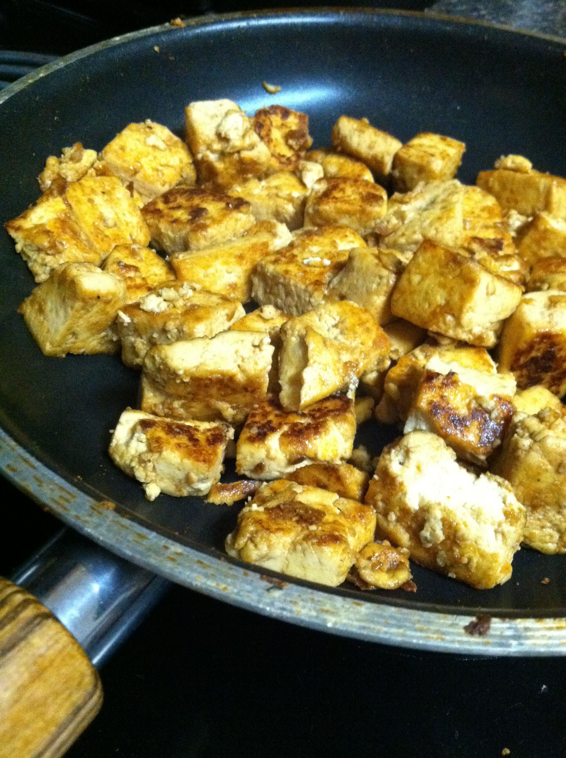 After it is finished marinating, throw the tofu in a frying pan or wok (no oil necessary) on medium heat, and stir/flip tofu until it’s crispy and browned on all sides.