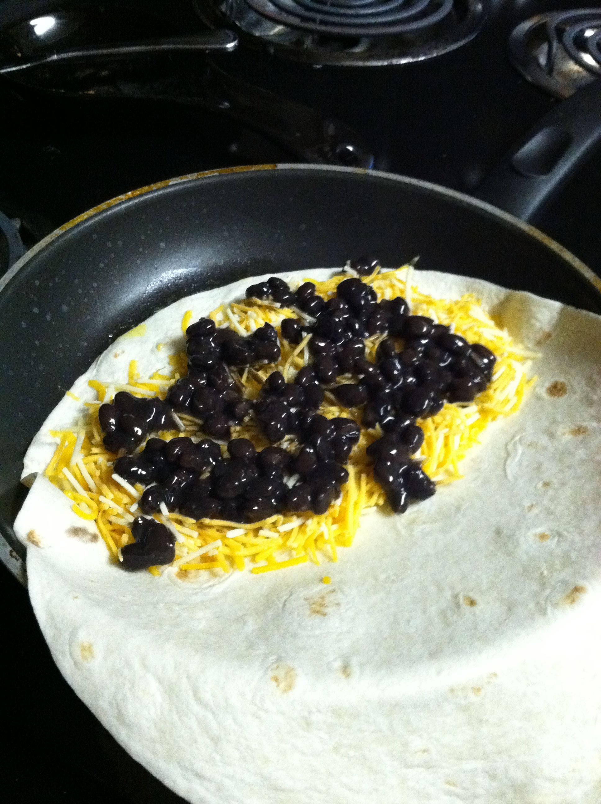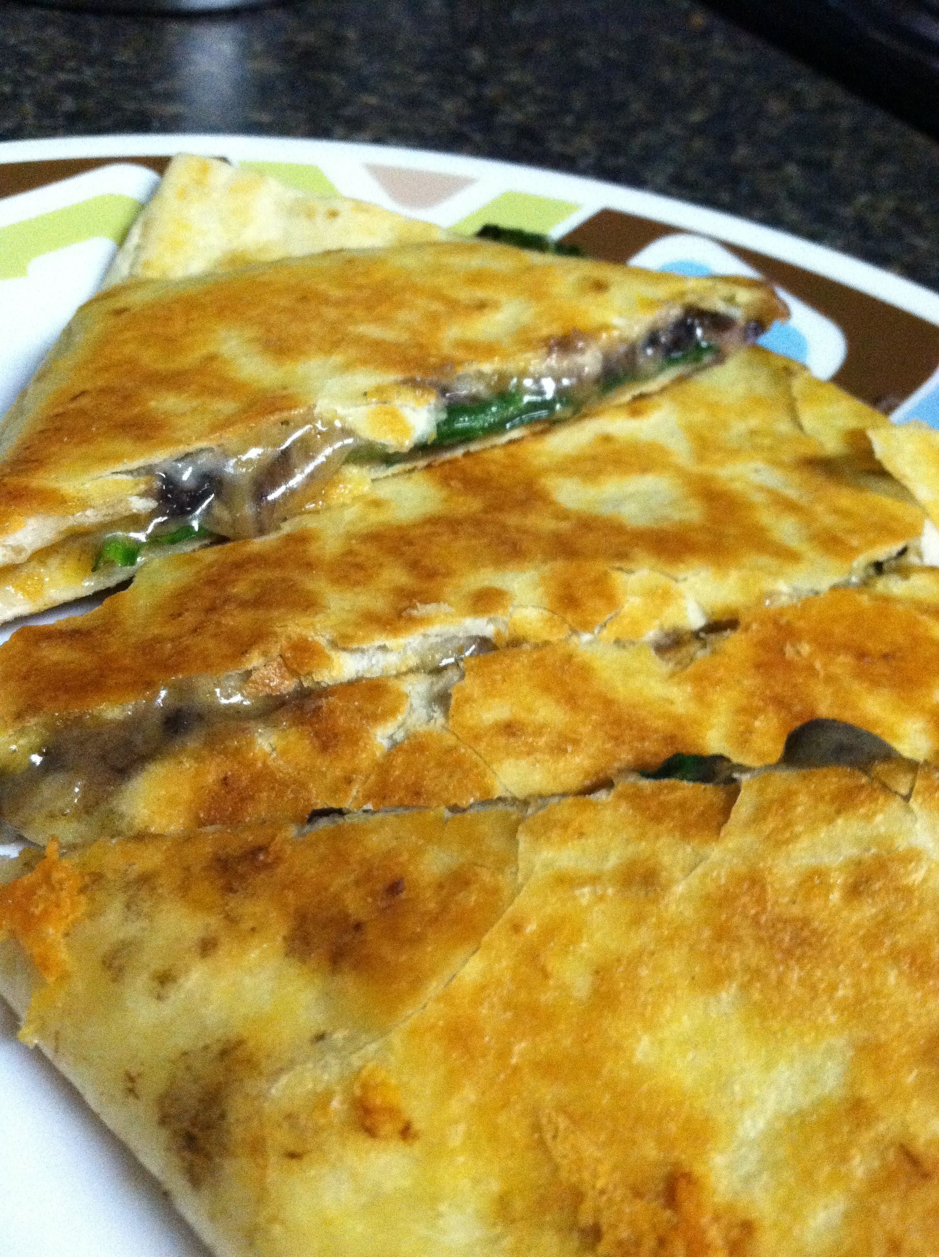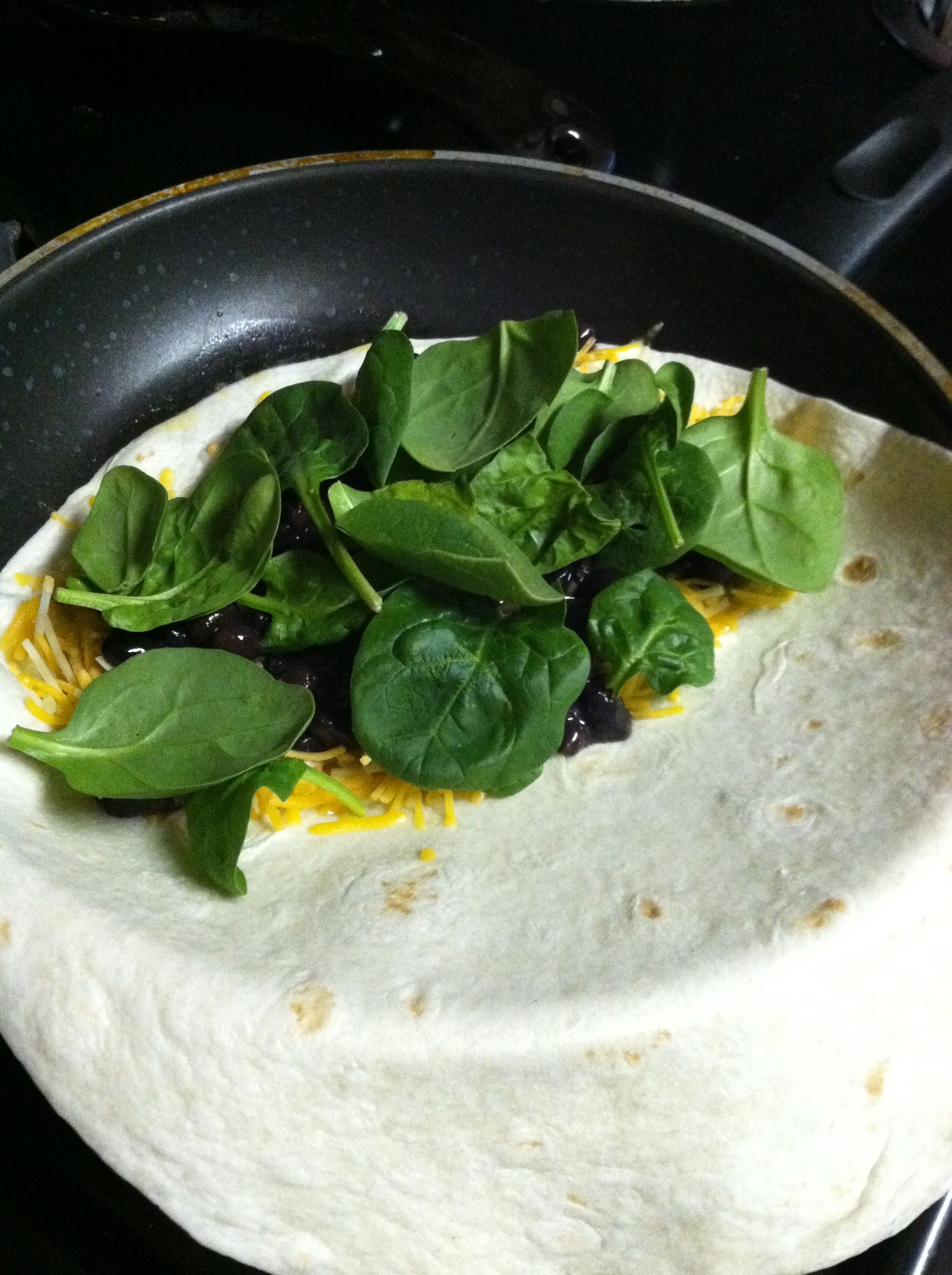 I’m a quesadilla nut. I’m not sure why but something about the crispy tortilla and melty cheesy goodness just makes me drool…to the point where I used to make quesadillas for breakfast…and lunch…and dinner. Thankfully I’m out of that phase, but quesadillas are still a go-to quickie meal for me. The spinach and black beans added to the traditional cheese quesadilla adds some protein and flavor to the traditional dish.