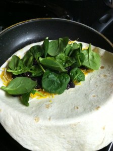 There are no real measurements in this recipe, since you can just put in the desired amount of everything. Obsessed with spinach? Add a whole bunch, or vice versa. Start by spreading your butter thinly over one side of the tortilla. Meanwhile, heat a large skillet to low-medium heat. Place the tortilla buttered side town in the heated skillet. Pile your ingredients onto one half of the tortilla, and fold over.