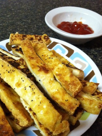 Now for the tofu fries. Drain tofu in a tofu press, or by placing block between two towels and leaving something heavy on top for 30 minutes to an hour. Slice tofu into fry-sized pieces and sprinkle with desired amount of sea salt and pepper. Meanwhile, heat oil in skillet on medium heat. Place tofu strips onto heated skillet and turn until crispy and brown on all sides. Place on paper towel to drain any remaining oil.