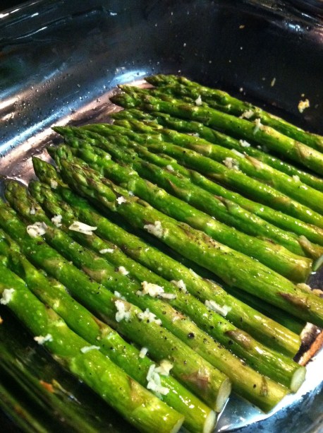 Preheat oven to 350 degrees. Place asparagus spears in a glass baking dish. Melt butter in microwave and pour over asparagus. Use olive oil instead to make this vegan and a bit healthier. Shake the dish around a bit until all the spears are well coated. Spread out flat in dish, and sprinkle minced garlic, salt, and pepper over the top.
