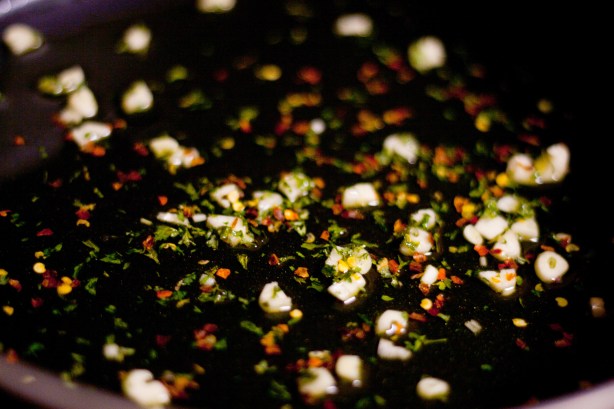 Meanwhile, heat 2 tbsp olive oil and garlic in large skillet. Once the garlic starts to get little bubbles around it, then add the red pepper and parsley.