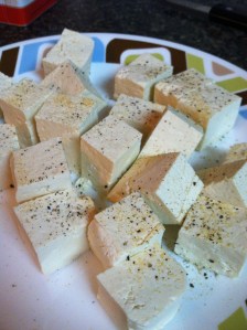 For the tofu, heat the oil in a wok or large skillet to medium-high eat. While the oil is heating, cube the tofu and sprinkle with pepper, salt, and garlic powder.