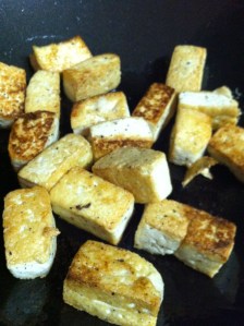 Once the oil is hot, add the tofu. Stir the tofu frequently so that each cube browns on all sides without burning.