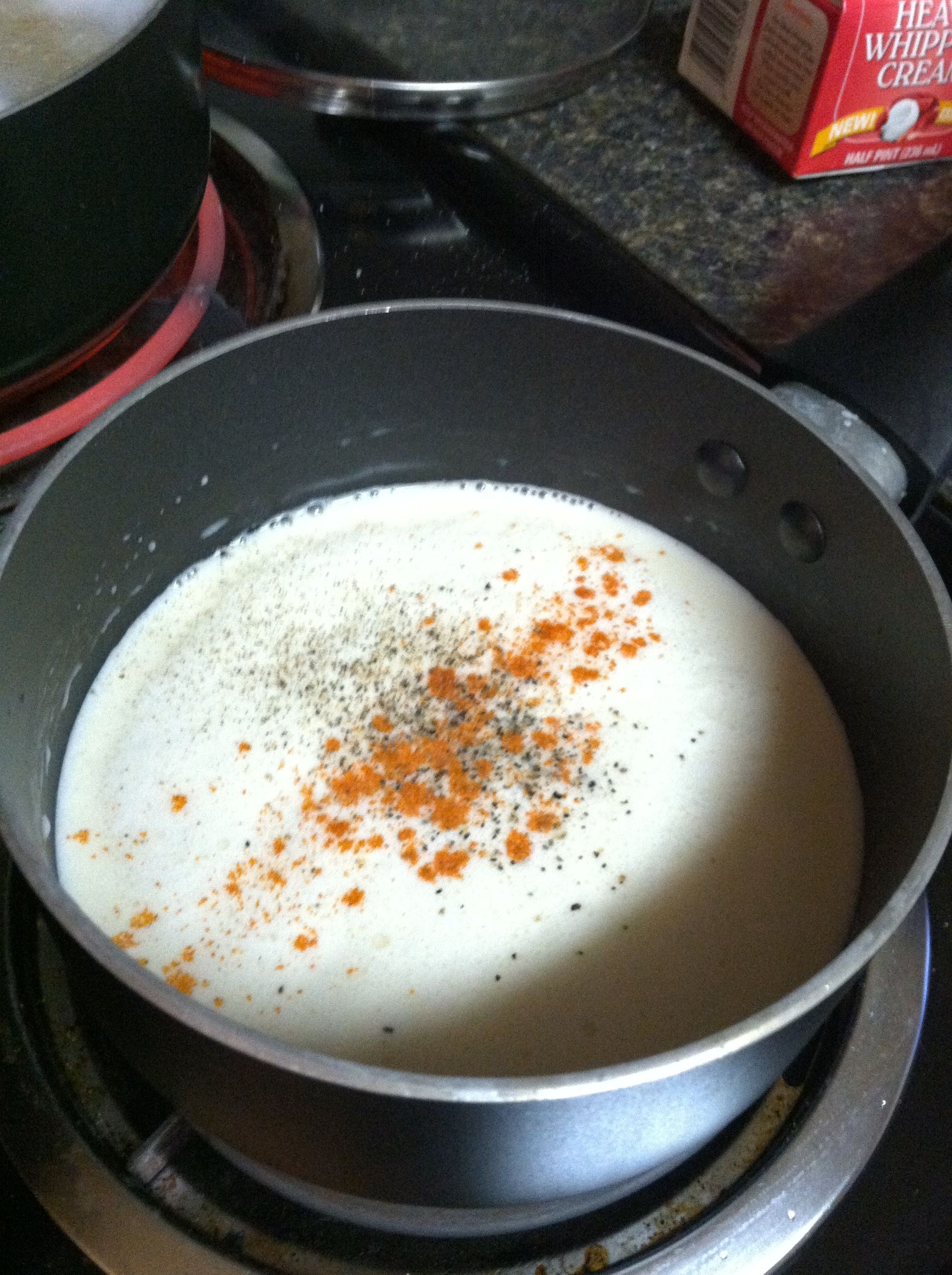 Mix cream, beer, pepper, salt, garlic powder, and paprika in a medium saucepan over low heat.