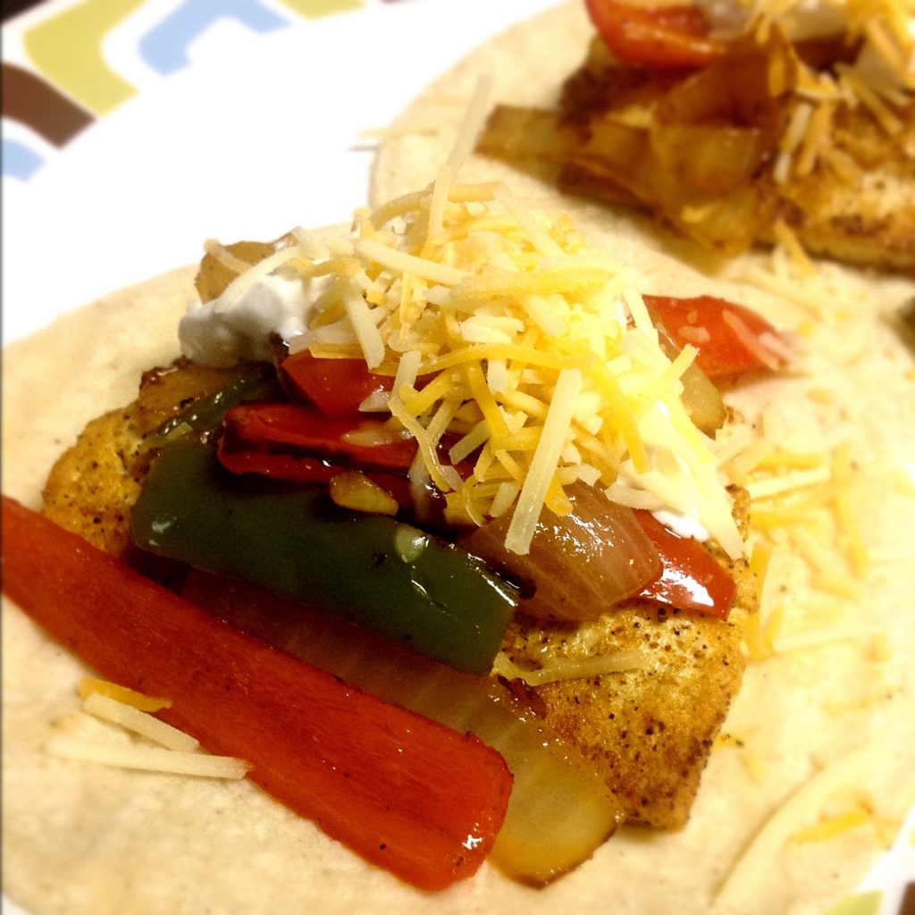 Slice peppers and onion into strips about 2-3 inches long. Sautée vegetables with 2 cloves minced garlic, 1 tsp of chili powder, and a couple dashes of cumin in olive oil over medium heat until crisp-tender.