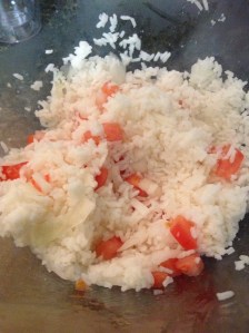 Cook rice according to directions on package. Chop tomato and 1/2 onion into small pieces. In large bowl, mix rice, tomato, onion, garlic, and sour cream.