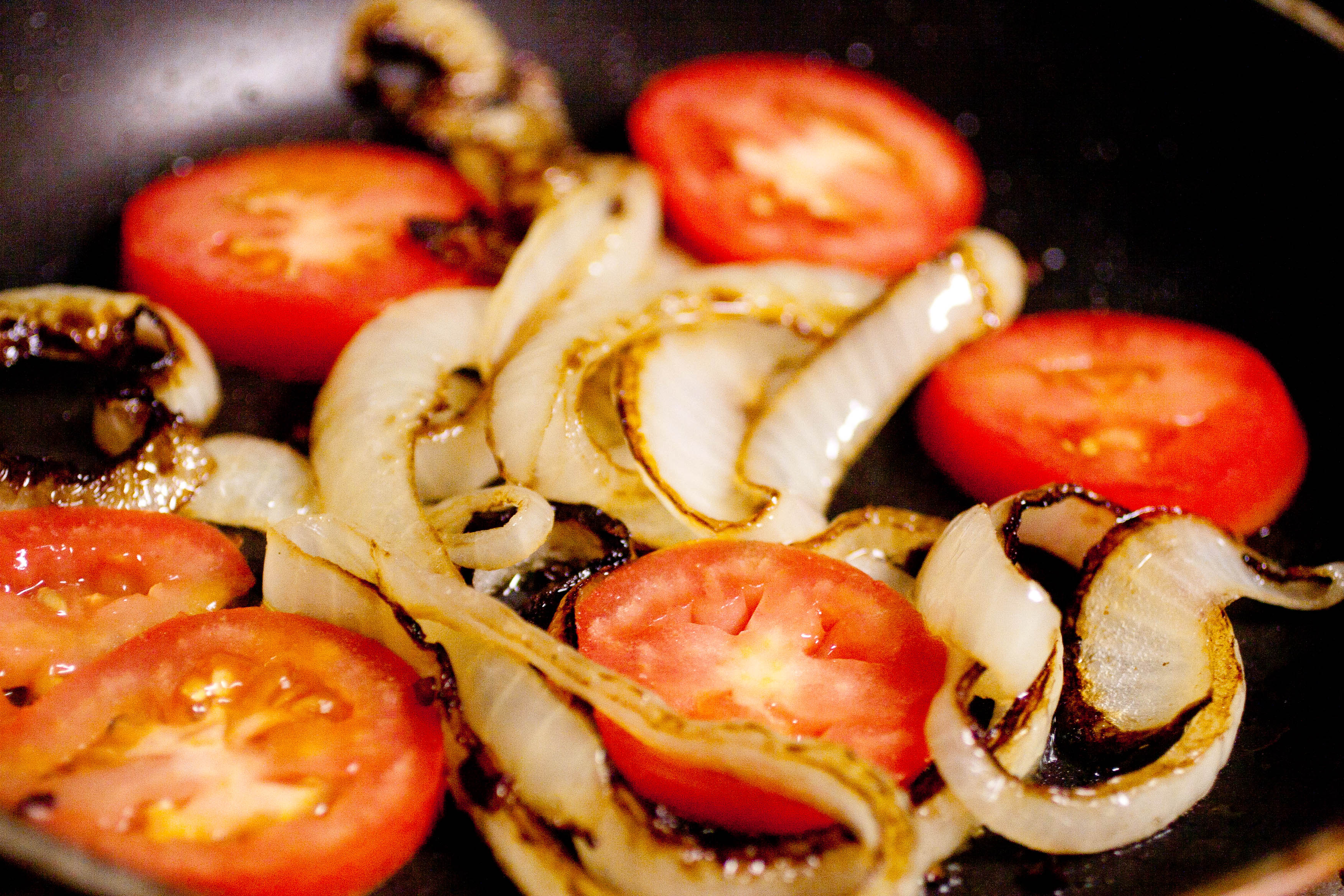 Heat olive oil and minced garlic over medium heat in skillet. After 1.5 minutes, add the onion, cut sideways to leave the thin rings intact. Once the onion is looking semi-translucent and browned on the edges, add the roma tomato, sliced into 1/4 inch thick circles. “Grill” until tomatoes are soft, but not mushy. Remove from pan and set aside.
