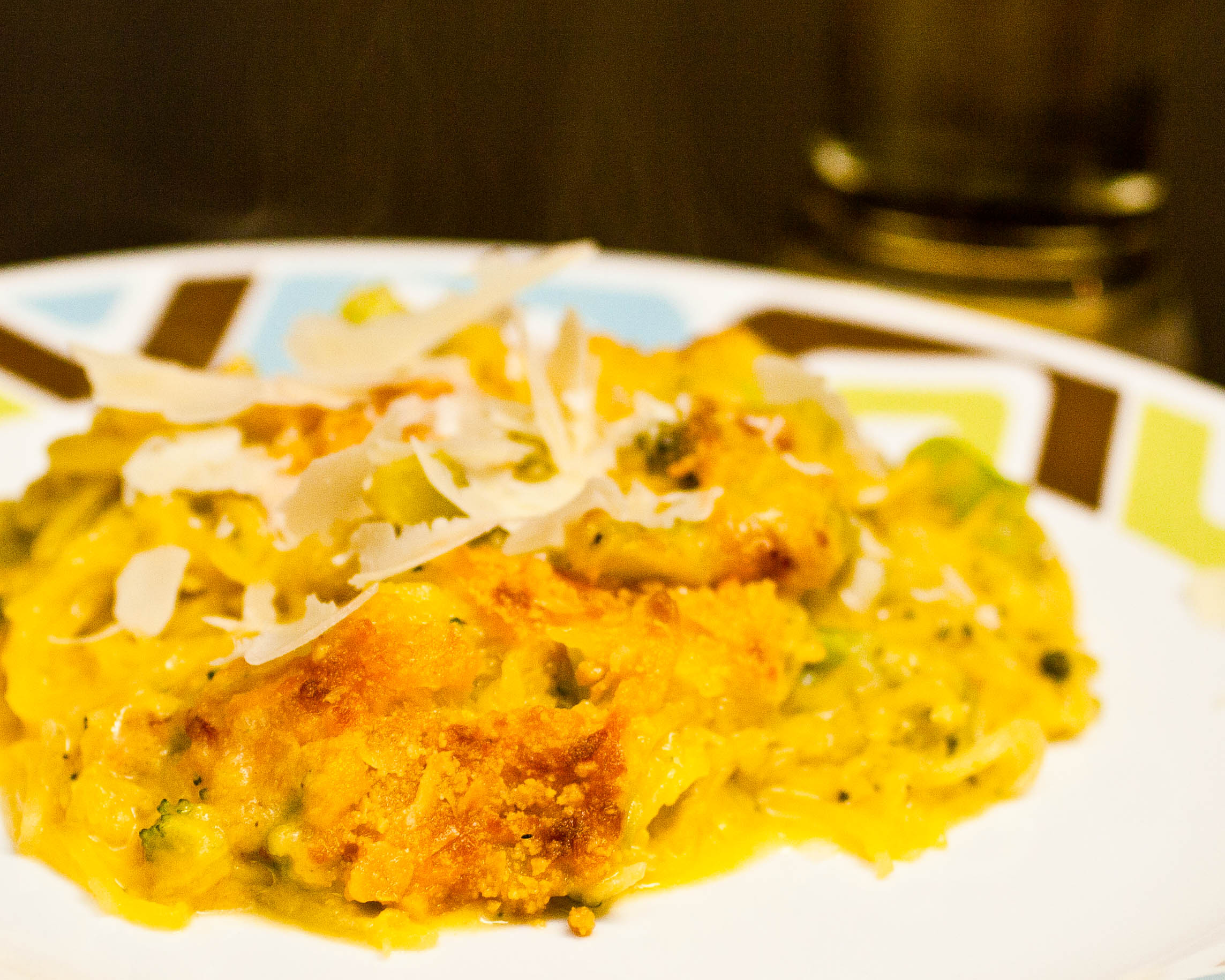 Add the broccoli and the warm cheese sauce to the bowl of squash noodles and mix until everything is well-coated in the sauce. Transfer to a 13 x 9 baking pan.
