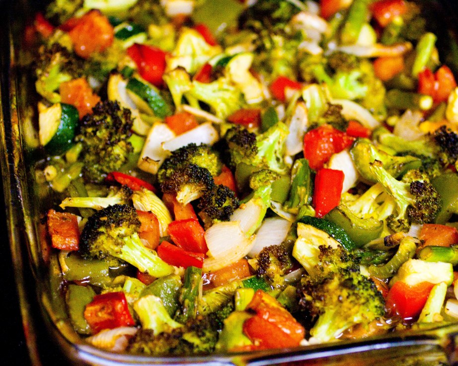 Spread all the vegetables evenly in a 13 x 9 glass baking dish. Pop in the oven for 30-40 minutes, or until the tops of the broccoli are looking browned, and all veggies are tender.