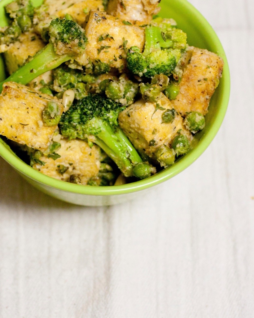 Once tofu is browned and crispy on the outside, add pine nuts, broccoli and peas and continue to sautee for 2-3 minutes. Lower heat to low-medium, and add Tofutti sour cream parsley, and lemon juice. Stir and continue to sautee until the sauce coats all tofu and vegetables. Remove from heat and stir in breadcrumbs so that they coat all ingredients.