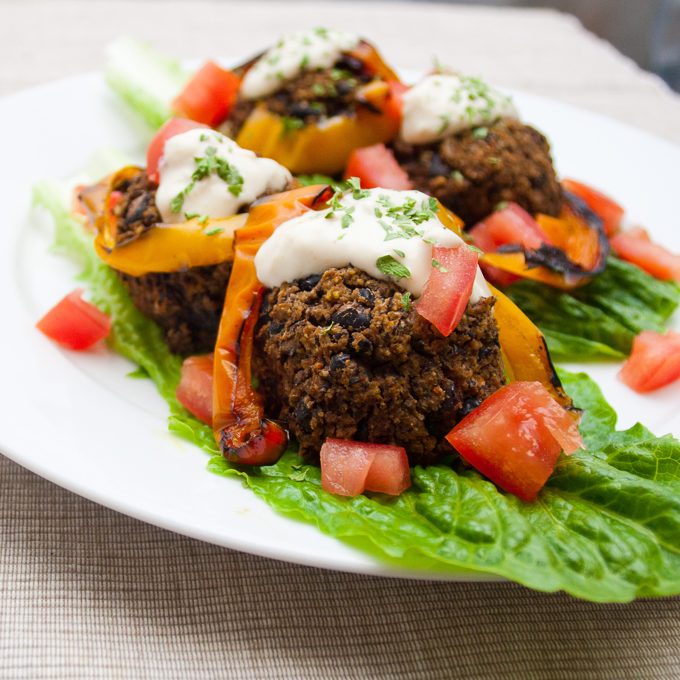 Eat over pasta, on their own, or in a lettuce wrap as I did! I topped them with diced tomato, leftover grilled peppers, and spicy vegan aioli (Veganaise, fresh minced garlic, lemon juice, and cayenne).