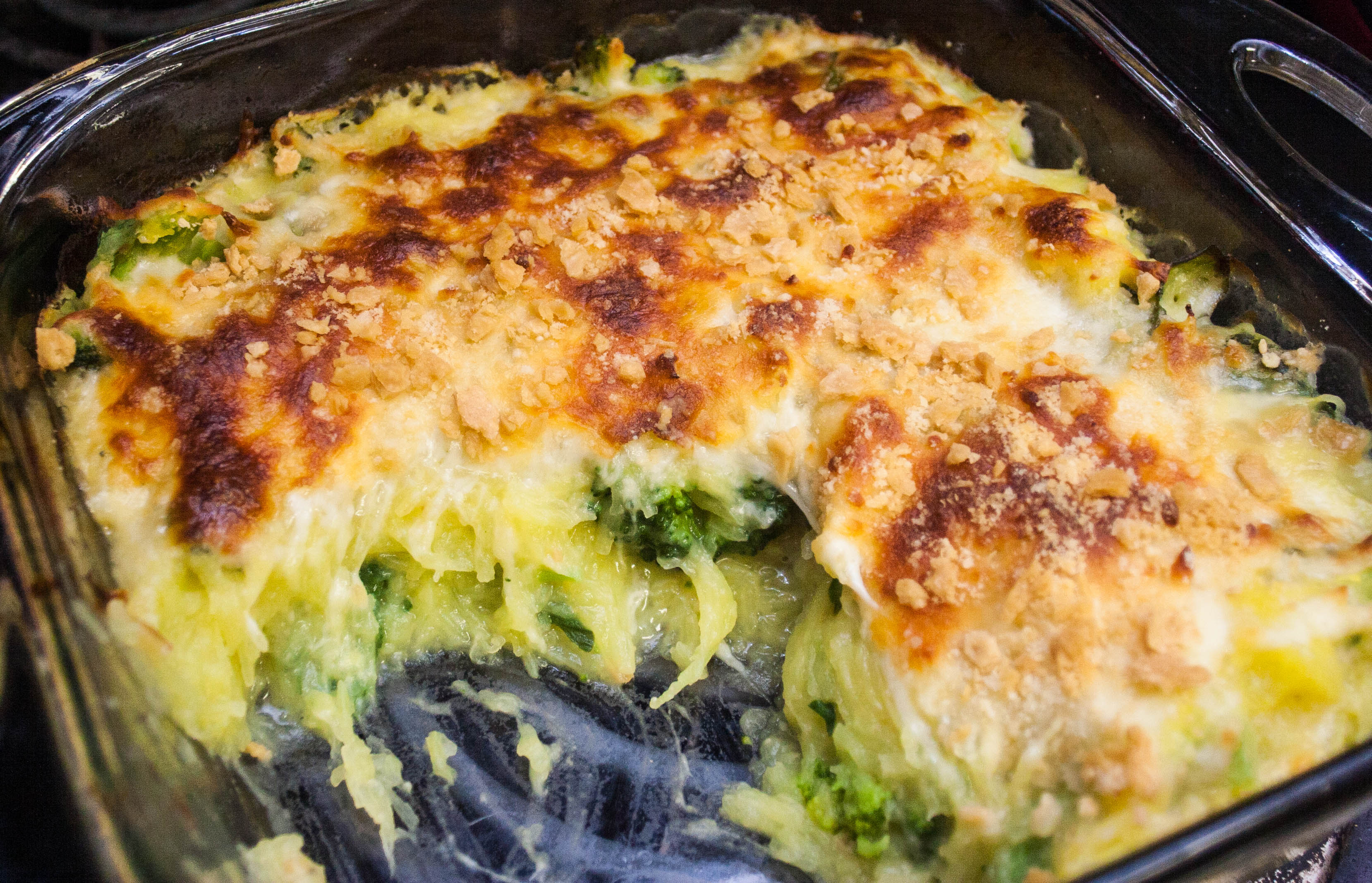 Mix the spaghetti squash “noodles” with the broccoli, spinach, alfredo, and half of the mozzarella. Stir until all ingredients are well integrated.
