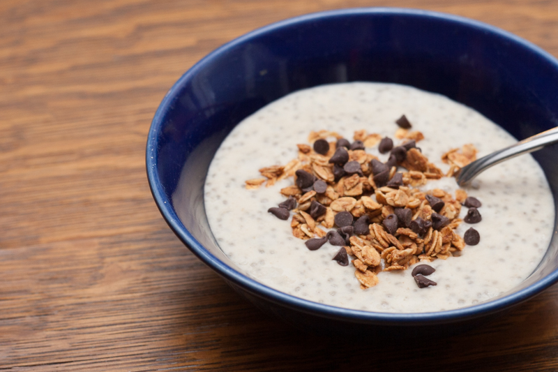 When mixed with water or any other liquid, chia seeds form a kind of gel. I’ve used this gel to help bind black bean burgers together, and it works great for that as well! So when you mix more chia seeds with more liquid, you get a pudding, much like tapioca. A lot of people have been eating this pudding for breakfast, since (if you use the right ingredients) it can be crazy nutritious.